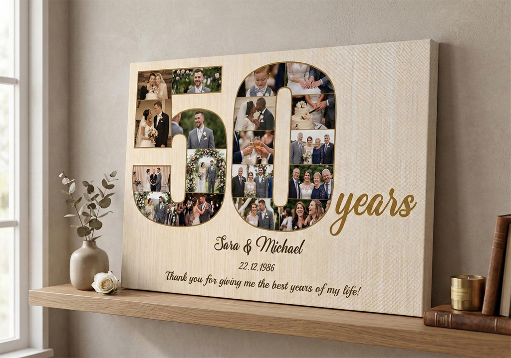 Celebrate five decades of shared laughter and love. Consequently, this piece transforms your memories into a lasting work of art. You can easily upload several photos to create a stunning visual narrative. Furthermore, the realistic wood texture provides a rustic yet elegant touch.