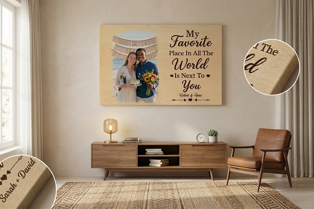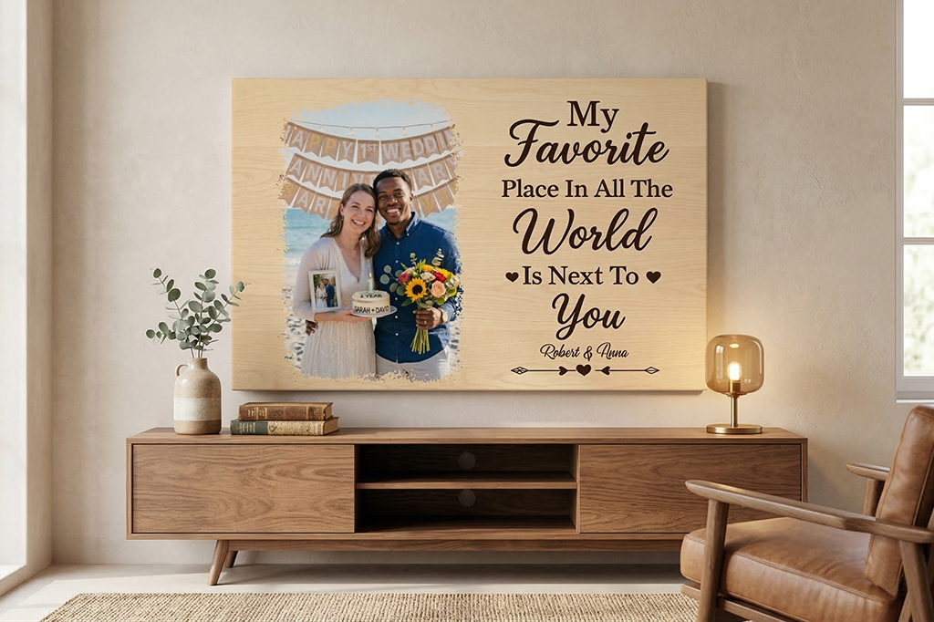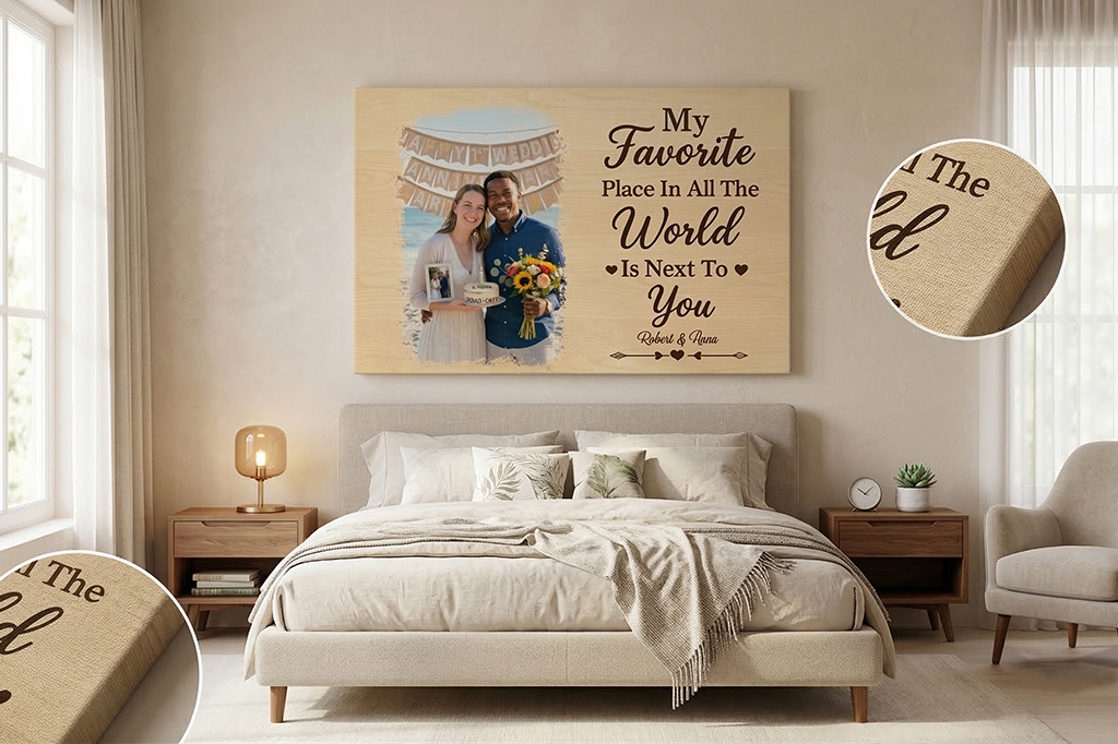 Commemorate your special bond with this stunning artwork. Furthermore, this piece features the heartwarming quote “My Favorite Place In All The World is next to you.” You can customize it easily to create a unique memory. Consequently, it makes an ideal gift for weddings or major milestones. Because your love deserves a beautiful display, we use only premium materials for every order.