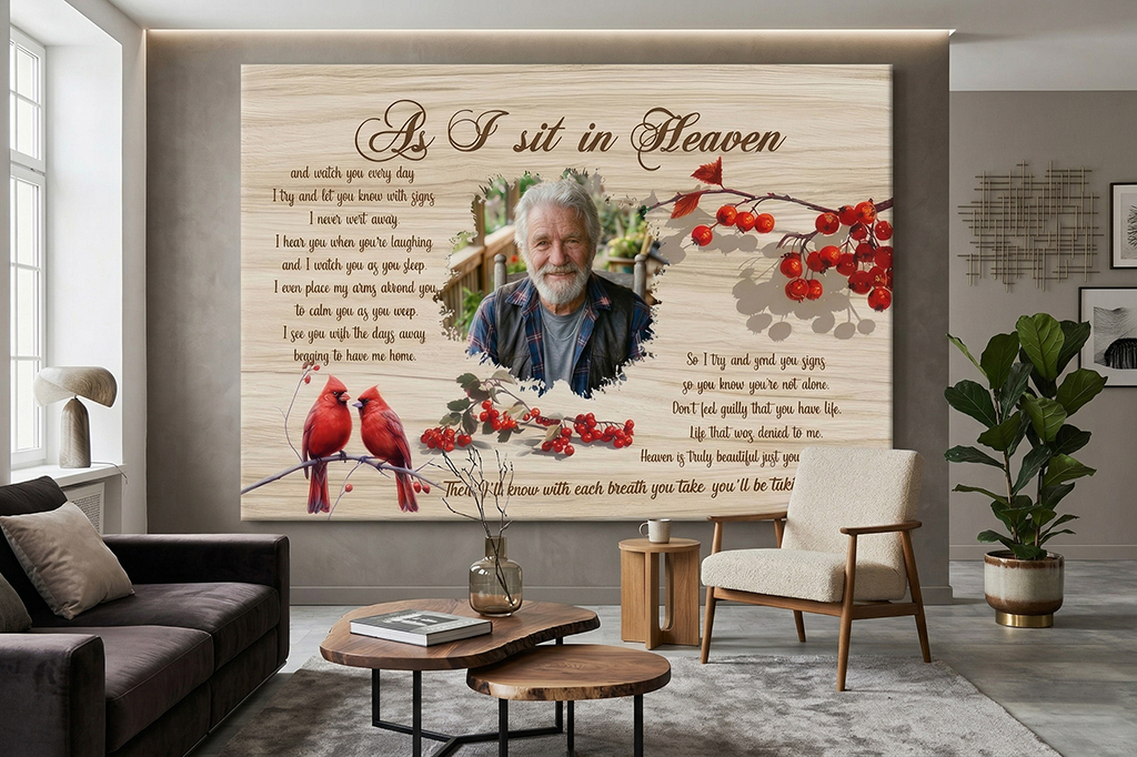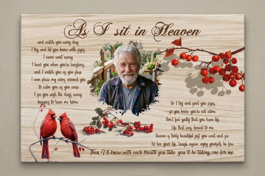 Create a lasting tribute with our Heaven Memorial Canvas. First, choose your favorite photo of any loved one. Moreover, we combine your selected image with the touching poem. This beautiful piece offers deep comfort during difficult times. Consequently, you keep their presence felt in your home forever.