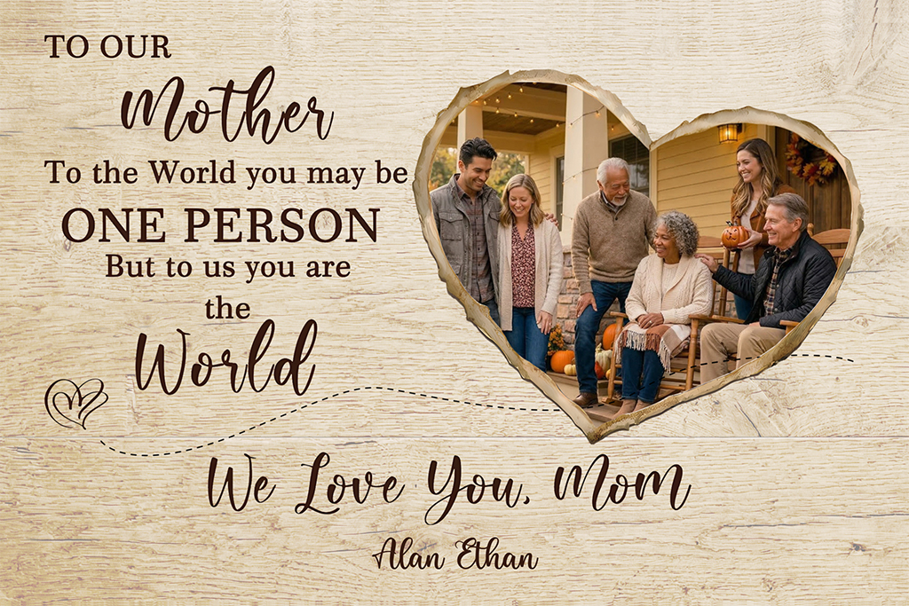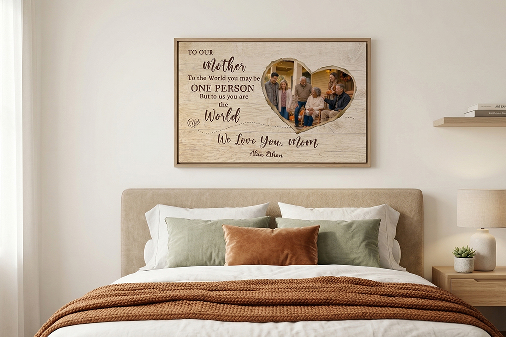 Finding the perfect present often feels challenging. However, this personalized mom gift makes your choice easy and meaningful. Specifically, it highlights the bond between a mother and her child. This canvas features the touching quote: “To the World You May Be One Person, But To Us You Are the World.” Consequently, it creates a lasting memory on her wall.